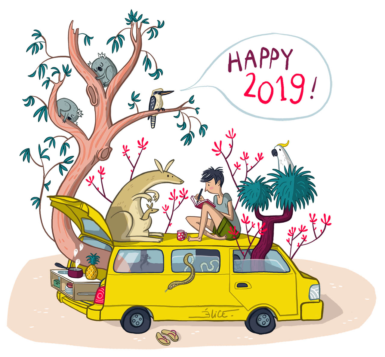 Je joue les prolongations en vous envoyant aujourd’hui mes vœux pour 2019. Vous avez remarqué, l’anticipation n’est pas au programme de mes résolutions ! En revanche, cette carte a été pour moi un bon prétexte pour m’initier à un nouveau logiciel. C’est donc en images animées que je vous souhaite la bonne année !