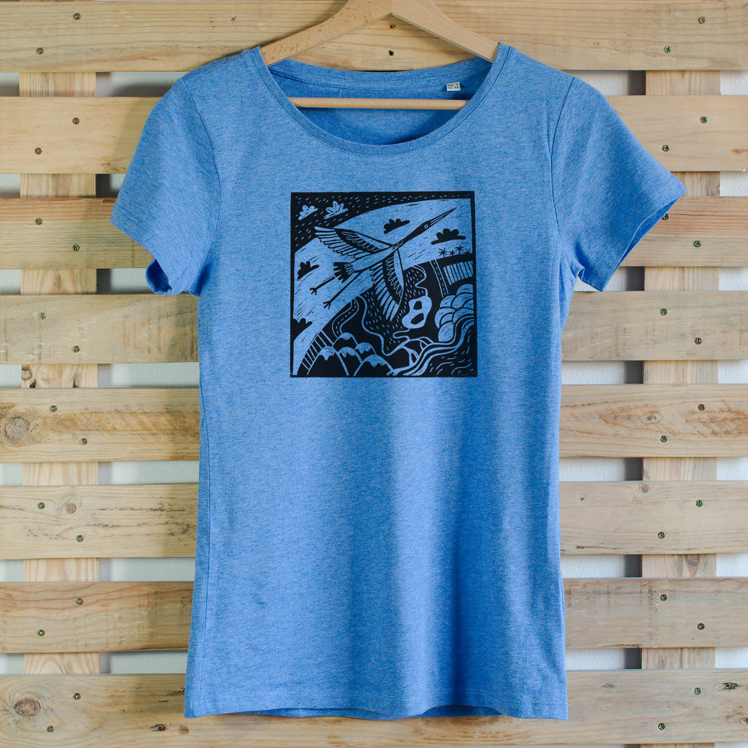 Le visuel a été gravé à la main dans une plaque de linoléum avant d’être pressé sur le T-shirt. Le visuel prendra son aspect définitif après le premier lavage, qui lui donnera un petit côté légèrement passé. Après ça, il ne bougera plus ! L’encre à base d’huile de lin, ne contient pas de métaux lourds et résiste très longtemps aux lavages.