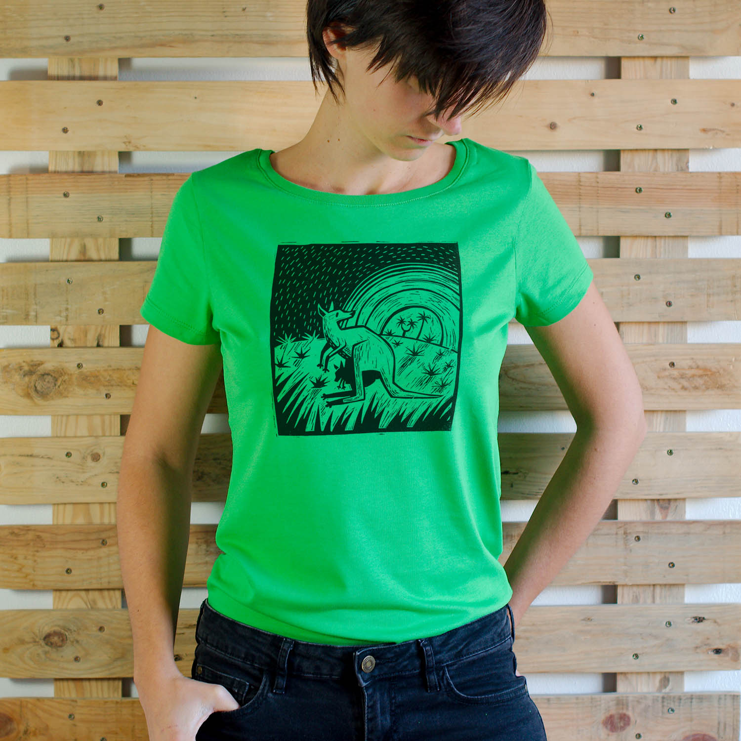 Le visuel a été gravé à la main dans une plaque de linoléum avant d’être pressé sur le T-shirt. Le visuel prendra son aspect définitif après le premier lavage, qui lui donnera un petit côté légèrement passé. Après ça, il ne bougera plus ! L’encre à base d’huile de lin, ne contient pas de métaux lourds et résiste très longtemps aux lavages.